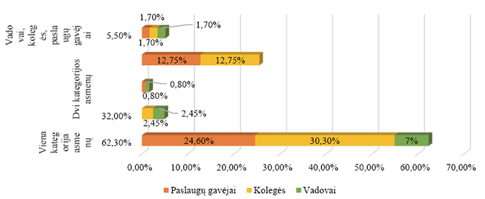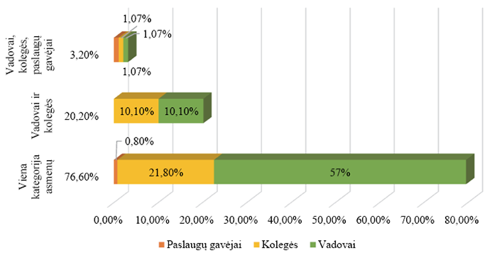 Tarp tiriamųjų, kurios nurodė gavusios pozityvų palaikymą, 62,3 proc. nurodė jį gavę iš vienos kategorijos asmenų, 32 proc. iš dviejų kategorijų ir 5,7 proc. iš visų trijų kategorijų asmenų (vadovių, kolegių ir paslaugų gavėjų).