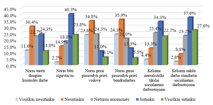 Kategorija, kurioje pastebėti ryškiausi skirtumai tarp respondenčių vertinimų – savęs realizavimas darbe (žr. 4 pav.). Noras būti išgirstai ir aukšti darbo standartai buvo išskirti kaip stiprūs motyvatoriai pasipriešinimui (atitinkamai 64,1 proc. ir 65,2 proc. „sutinka“ ir „visiškai sutinka“). Tai rodo, kad darbuotojos jaučia ne tik profesinio pasitenkinimo, bet ir pripažinimo darbo vietoje poreikį, vertina galimybę dalyvauti sprendimų priėmimo procese ir prisidėti prie kokybiškesnių paslaugų teikimo. Nerealistiški tikslai, keliantys frustraciją dėl organizacinių lūkesčių, kurie neatitinka realių galimybių ar resursų taip pat stipriai veikia pasipriešinimo motyvaciją (57 proc. „sutinka“ ir „visiškai sutinka“). Kiti trys veiksniai: „noras gerai pasirodyti prieš bendradarbes“ (60,2 proc. „visiškai nesutinka“ ir „nesutinka“), „noras gerai pasirodyti prieš vadovą“ (58,6 proc. „visiškai nesutinka“ ir „nesutinka“) ir „noras turėti daugiau kontrolės darbe“ (42 proc. „visiškai nesutinka“ ir „nesutinka“) buvo įvertinti kaip mažiau motyvuojantys atskleidžia, jog socialinės darbuotojos orientuojasi labiau į paslaugų gavėjų poreikius ir profesinės etikos principus, o ne į asmenines ar karjeros ambicijas. Šioje veiksnių kategorijoje, lyginant su jau aptartomis anksčiau, didžiausia dalis respondenčių (vidutiniškai 22,6 proc.) neturėjo nuomonės dėl jų poveikio motyvuojant pasipriešinti.