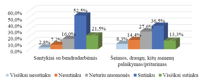 Santykiai su kolegėmis, šeimos, draugų, artimųjų palaikymas gali įtakoti, kiek socialinės darbuotojos linkusios naudoti pasipriešinimą (žr. 3 pav.). Santykių kategorijoje respondentėms svarbesnis motyvacinis veiksnys buvo profesiniai, nei asmeniniai santykiai ir palaikymas. Tvirti profesiniai santykiai organizacijos viduje gali kurti kolektyvinio tapatumo jausmą, rodyti bendras vertybes, kas savo ruožtu gali skatinti ir dažnesnius pasipriešinimo veiksmus, ir, atvirkščiai – pasitikėjimo ar palaikymo tarp kolegių stoka gali nuslopinti pasipriešinimą arba izoliuoti individus. Artimųjų palaikymo įtaka pasipriešinimo veiksmams yra mažesnė ir labiau pasiskirsčiusi. Taigi artimieji nesiejami su profesinėmis dilemomis, bei tikėtina negali suteikti tokio pat lygmens supratimo ir palaikymo dėl veiksmų darbinėje aplinkoje, kaip kolegės. Galima pastebėti, kad gerokai daugiau respondenčių neutraliai vertino artimųjų palaikymą (27,6 proc.), nei bendradarbių palaikymą (16 proc.), kas rodo, kad kolegių palaikymas yra aiškiau suvokiamas ir mažiau diskutuotinas, nei artimųjų įtaka.