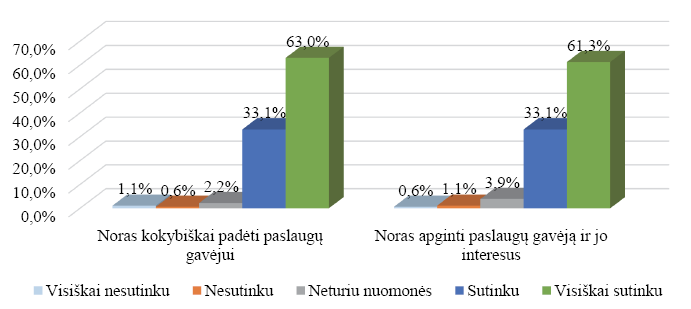 Santykis su paslaugų gavėju ir orientacija į jo gerovę, buvo pagrindinė veiksnių kategorija, stipriausiai motyvuojanti tyrime dalyvavusių socialinių darbuotojų pasipriešinimą. Šioje kategorijoje du veiksniai motyvavo jas priešintis stipriausiai: „noras kokybiškai padėti paslaugų gavėjui“ bei „noras apginti paslaugų gavėją ir jo interesus“. Vertinimų pasiskirstymas pateikiamas žemiau esančiame paveiksle.