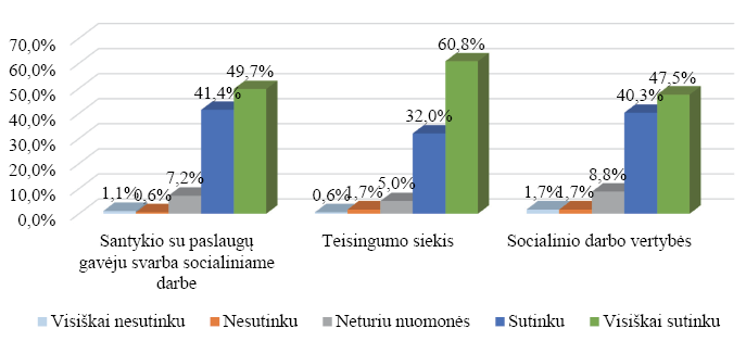 Paskutinė veiksnių kategorija, kurios poveikį motyvacijai buvo prašoma respondenčių įvertinti – bendrieji socialinio darbo principai (žr. 5 pav.). Šioje kategorijoje buvo trys veiksniai ir visi jie gana vienareikšmiškai skatino respondentes priešintis („sutiko“ ir „visiškai sutiko): „santykio su paslaugų gavėju svarba“ 91,1 proc., „teisingumo siekis“ 92,8 proc. ir „socialinio darbo vertybės“ 87,8 proc. Tik nedidelė dalis respondenčių neturėjo nuomonės dėl šių veiksnių poveikio ir dar mažesnė dalis nesutiko ir visiškai nesutiko, kad šie veiksniai motyvuoja priešintis.