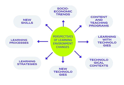 During the practical workshops, concept maps were drawn up, reflecting the main changes in learning strategies and the response of learning systems to the challenges posed. Although each of the jointly created visions has its own clear emphases and scopes, together they form a detailed diverse and changing model of expression, where technological trends and socio-economic dynamics affect teaching/learning strategies and perspectives of their expression. As a result, there is a need to reflect on fundamental changes in the learning environment. The evaluations and attitudes of the teachers who participated in the study about the changes in the learning environment are revealed through the logograph presented below (see Figure 1).