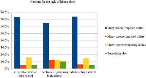 Since again there are no major difference between schools, the Chi-square test is used to check the frequency of selecting individual reasons for the lack of leisure time with respect to the grade. Dependence in terms of having many school-imposed duties with respect to the grade was checked to find a statistically significant dependence for all grades (second grade: the cut-off value of the Chi-square test with 2 degrees of freedom, p<0.001, is 18.4, and the obtained Chi-square test is 19; third grade: the cut-off value of the Chi-square test with 2 degrees of freedom, p<0.001, is 19.1, and the obtained Chi-square test is 17.7; fourth grade: the cut-off value of the Chi-square test with 2 degrees of freedom, at the significance level of 0.1%, is 14.9, and the obtained Chi-square test is 13.5, more details could be found in Table 3). In the second grade, having many duties as a cause of lack of leisure time is the most common choice in general-education high school students (98%), while 76% of students in second grade of electrical engineering high school report the same. In the third grade, this was the choice of all medical high school students and 82% of electrical engineering high school students. In the fourth grade, all electrical engineering high school students reported having many duties as the cause of the lack of leisure time, just like 80% of general-education high school students. One cannot ignore the fact that some students have undertaken many duties themselves, including 17% of general-education high school students, 12% of electrical engineering high school students and 15% of medical high school students. The causes of the lack of leisure time such as ‘I have to study for graduation’ and ’I do not know how to use leisure time in the right way’ are stated by 7% of general-education high school students, 15% of electrical engineering high school students and 7% of medical high school students. The Chi-square test checked the dependence in terms of many parents-imposed duties with respect to the school and the grade. Statistically significant dependence was not observed. In the opinion of students in all the grades of all the three schools, many duties imposed by parents are rarely the cause of the lack of leisure time.