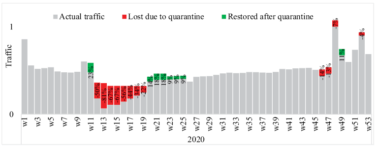 Quarantine has a significant negative impact on organic traffic, but consumers have almost restored their economic behavior. Some part of consumers’ demand was deferred from the period of lockdown to the next periods. A sharp decline in mobility and population’s income has led to a significant reduction in traffic (up to 81%), but after the restrictions are lifted, consumers’ activity is gradually recovering, partially compensating for the loss of lockdowns (there was additional growth of traffic by up to 18%) (Fig. 3).