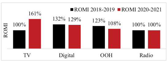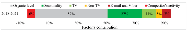 In 2020–2021, the contribution of media support into offline traffic increased to 18%, where 14% was generated by TV and 4% by other media channels. The impact of OOH advertising decreased from 4% to 0.5% due to drop in volume of pressure and drop in media response as a reaction on lockdowns and decreasing of consumer’s activity in period of COVID-19. The impact of Digital is unchanged in this period, but there is significant growth in the contribution of TV in case of similar level of media investment. In this situation, there is an increase of ROMI as a result of changes in split of formats.