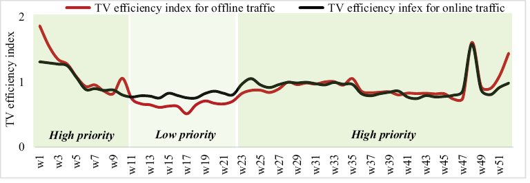 TV is the main driver of offline traffic (Fig. 4). In average, the contribution of TV is about 11%, the influence of non-TV channels is 5%, where Digital accumulates 3% of traffic. So, 69% of media contribution is generated by TV and 31% by non-TV media, but share of non-TV is increasing due to changes in media mix.