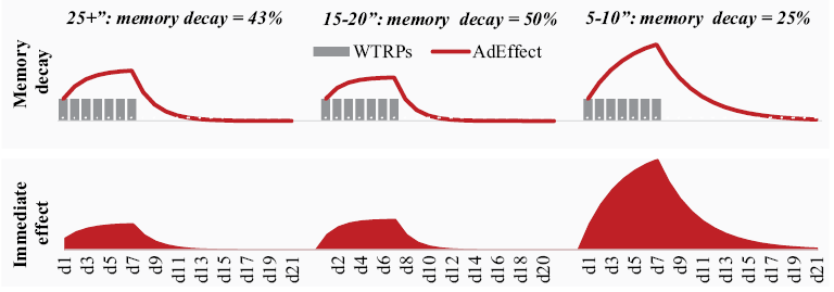 The effectiveness of the video is determined by the memory decay and the level of instant response (Fig. 8). Considering memory decay, there are opportunities to optimize the architecture of campaigns by realizing constant presence with up to two weeks break between flights.