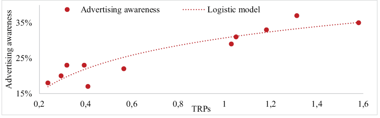 Media activity determines the advertising awareness and brand awareness, as a result. There are nonlinear connections between media pressure (in TRPs) and advertising awareness (Fig. 9). To achieve an advertising awareness of 30+%, it is necessary to realize some level of TRPs per media campaign.