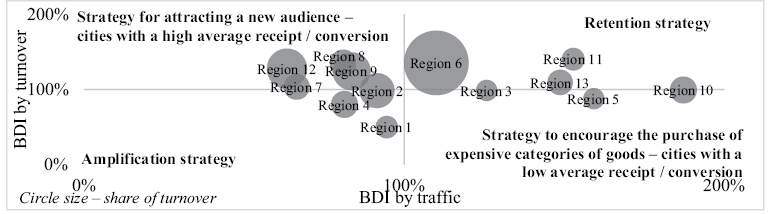 Different product structure and consumer preferences require the development and implementation of regional communications. Each segment needs to be supported, but with adaptation of media pressure, according to the strategic focus. Considering the results of BDI and CDI analysis (Fig. 12), the best decision is to realize coverage solutions for the whole of Ukraine and additional support in key cities by OOH, because they have the highest capability for business growth.