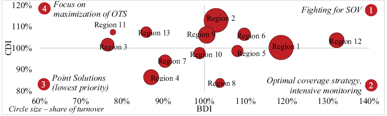 Evaluation of the market potential with Brand Development Index (BDI) and Category Development Index (CDI) helps to increase the opportunities for key business segments, prioritize work with them and optimize the marketing investments. It is a useful and effective tool for strategic planning, which makes it possible to analyze the regional specifics of doing business.