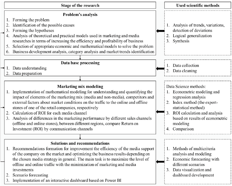 There is a need to analyze a wide range of factors and their impact by modeling key business indicators and to effectively manage the performance of retailing. Thus, in order to avoid possible threats and to be able to assess the possible consequences, to find the best ways to develop business, companies need to use modern implements that will increase the enterprise efficiency (Podskrebko et al., 2019). Mathematical modeling, more specifically, marketing mix modeling, is one of the main tools for realization of these substantial tasks.