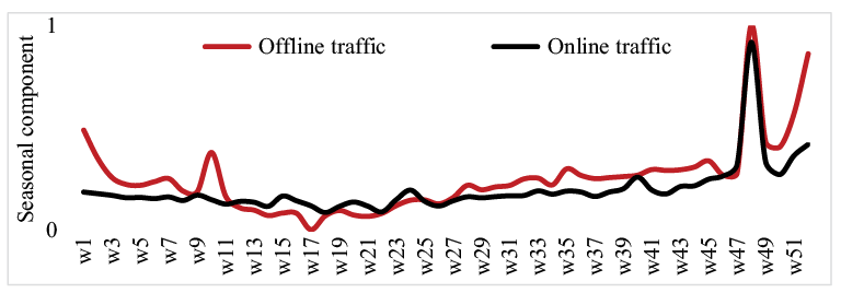 Significant seasonality is typical for business: demand for this market is growing significantly in the second half of the year, which is similar to general consumer’s economic activity. The seasonality is the same for offline and online traffic. Black Friday, New Year are key periods during a year (Fig. 2). Periods from January to March and from August to December are the periods of highest sales level. The seasonality contribution was determined as additive seasonality in models, and it varies during the year from 8% to 41%.