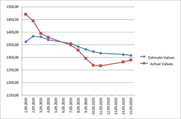 The comparative graph of the 11-day estimated and actual values of the Baltic Dry Index with NARX neural network is given in Figure 10.