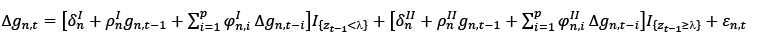 In equation (4), I {x} is an indicator that takes the value 1 when x is true and 0 otherwise. Therefore, if the condition 𝑧𝑡−1 < 𝜆 is met, the variable that takes a unit value acts as a dummy variable. If 𝑧𝑡−1 < 𝜆 and “regime II”, then the situation with 𝑧𝑡−1 ≥ 𝜆 is called “regime I”. Therefore, 𝜆 is a “threshold” parameter, and equation (2) belongs to the class of threshold autoregressive (TAR) models primarily developed by Tong (1978).