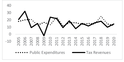 Budget deficits, which hurt the overall macroeconomic performance of the country, are among the most important problems in Turkiye, as in most countries (Özsoy, 2008). As mentioned above, among the main causes of budget deficits are the higher increase in public expenditures compared to public revenues and the more significant fluctuation in tax revenues over the years. In other words, in Turkiye, tax revenues cannot adequately meet the fiscal aim. This situation in Turkiye can be seen in Figure 1.