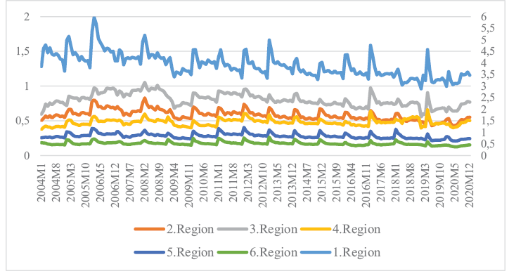 In Figure 2, the first region is shown on the secondary axis, and the other regions are shown on the primary axis. Accordingly, it is seen that the first region contributes the highest part to closing Turkiye’s budget deficit. Apart from the first region, it is seen that the other regions are quite close to each other. Table 1 contains the descriptive statistical information of the data used in the analysis.
