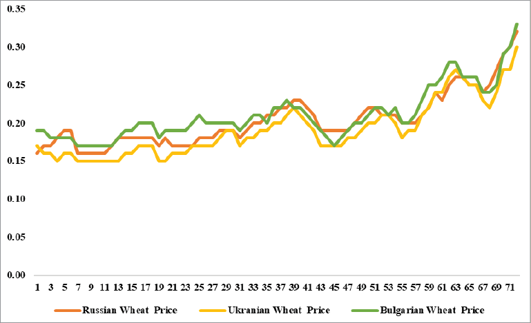 The changes in the prices per kilogram of wheat, the primary raw material for pasta production, applied by Russia, Ukraine, and Bulgaria, which are among the countries Turkey imports the most from, can be seen in Figure 2. According to this, while Ukraine offers the lowest prices and Russia offers the highest, the three prices are quite close to each other. Nevertheless, it is understood that wheat prices have almost doubled over the years.