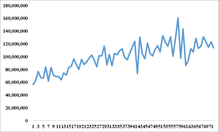 Econometric model of the study explains Türkiye’s pasta exports using variables such as Russia’s wheat export price, Ukraine’s wheat export price, Bulgaria’s wheat export price, and the exchange rate. Türkiye’s pasta exports represent the quantity of pasta exported from the country. The prices of countries represent the average wheat selling prices in their exports to the world. The exchange rate shows the Central Bank of the Republic of Türkiye’s USD/TRY rate. This exchange rate is included in the model due to the relationship between the exchange rate and exports as per classical economic thought. Graphs for these variables are presented in following figures. As the figures for the variables are at significantly different levels, the graphs are presented individually, as depicted in Figures below.