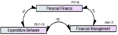 Figure 1 depicts the conceptual model aimed at cracking the wealth puzzle by investigating the interactions among personal finance (PF), expenditure behavior (EB), and financial management (FM). Following this conceptual framework, the utilization of Exploratory Factor Analysis (EFA) and Confirmatory Factor Analysis (CFA) is pivotal for developing and constructing hypotheses (H1: PF<--> FM; H2: EB<-->FM; and H3: EB<-->PF) that suggest specific relationships among the factors. H1 implies a relationship between PF and FM, indicating that strong personal finance habits may lead to effective financial management strategies and vice versa. Similarly, H2 and H3 propose relationships between EB, FM, and PF, respectively, shedding light on the interconnectedness of these factors. In summary, the conceptual model and the hypotheses derived from it provide a model for understanding of the intricate relationships between personal finance, expenditure behavior, and financial management, contributing to the broader goal of unraveling the wealth puzzle.