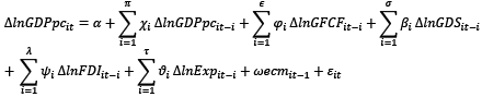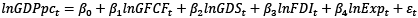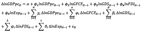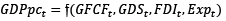 GDPpct represents the gross domestic product per capita, GFCFt stands for gross fixed capital formation, FDIt indicates the foreign direct investment, GDSt shows domestic savings, Expt represents total exports of goods and services, and εt is the error term.
