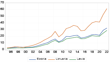 EU membership has helped these countries implement probusiness policies, streamline regulations, and invest in infrastructure. A well-educated workforce and competitive operational costs have made the Baltic states attractive locations for European and international businesses seeking access to the EU single market. Integration into the EU's single market has greatly boosted their trade volumes and export competitiveness. With tariff-free access to the world’s largest single market, businesses in the Baltics have expanded their exports and entered new markets both within the EU and globally. The Baltic countries have effectively leveraged their strengths in sectors like information technology, manufacturing, logistics, and agri-food products, enhancing both export performance and economic resilience. Infrastructure and transport projects, like Rail Baltica and Via Baltica, have improved regional connectivity and logistics, simplifying trade flows within and beyond the Baltic region (Stecenko, 2020). These countries also play an active role in shaping EU trade policy and negotiations, ensuring their interests are represented in global trade agreements. Their strategic position on the EU's eastern frontier gives them access to both European markets and those in other regions. Located at a key crossroads, the Baltic states act as vital transit hubs for trade between Northern Europe, Central Asia, and the Far East, facilitating the smooth movement of goods and services across borders.