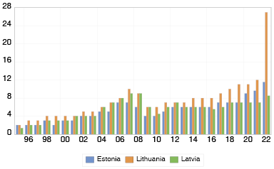 Figure 1 highlights the rise in GDP per capita across the Baltic nations over the sample period. Estonia shows remarkable growth, with GDP per capita rising from below $5,000 to over $25,000 by 2022. Lithuania, which initially lagged behind the other Baltic countries in the early 1990s, has made significant progress and caught up with its neighbors by the 2000s. Latvia, meanwhile, has seen steady and consistent increases in GDP per capita throughout this period. Figure 2 illustrates FDI inflows as a percentage of GDP in the Baltic states. Estonia stands out with significant growth, with FDI rising from less than 1% of GDP in 1995 to over 6% in 2021, outpacing all other Baltic countries before experiencing a sharp decline in 2022. Lithuania also recorded notable growth, although not as dramatic as Estonia's. In contrast, Latvia's FDI inflows have shown fluctuations over the years. Figure 3 shows export trends among the Baltic countries. Lithuania experienced a dramatic surge in exports, increasing from under $10 billion in 1995 to over $50 billion by 2022, reflecting rapid industrialization and economic growth. Estonia also saw a significant rise in exports, though not as pronounced as Lithuania's. Latvia’s export growth during this period has been relatively modest. Figure 4 depicts the growth rates in gross fixed capital formation across the Baltic states. Lithuania leads with the fastest growth rate, highlighting its dynamic economic development and favorable investment environment. Estonia and Latvia show more consistent, steady growth in this area. Figure 5 reveals trends in gross domestic savings from 1995 to 2022. Latvia consistently leads in domestic savings throughout the period, maintaining a strong position. Estonia also demonstrates significant growth in domestic savings over time. On the other hand, Lithuania experienced relatively lower growth in domestic savings during the study period.