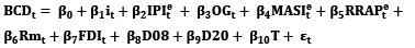 where BCDt is business credit demand, it the real interest rate, IPIte the expected industrial production index, OGt the output gap, MASIte the expected Moroccan All Share Index, RRAPte the expected residential real estate price index, Rmt remittances, FDIt foreign direct investments, T a linear trend, and D08 and D20 are dummy variables indicating the impact of the 2008 and the COVID-19 crises, respectively