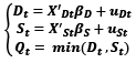 where Dt is the demand for credit in t, St is the supply of credit in t, XDt and XSt are two vectors of independent variables of Dt and St, respectively, and uDt and uSt are i.i.d residuals. Furthermore, (6) is the short-side rule equation which, for each period t, associates the short side (the minimum of Dt and St) with Qt the quantity of observed credit.