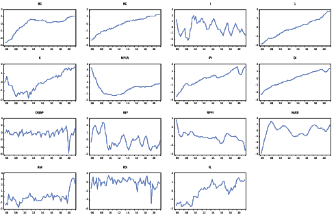 Since we are mainly interested in long-run credit dynamics, some data transformations are necessary. First, we eliminate the effect of inflation on the levels of our variables by deflating all stock variables using the consumer price index. Second, to isolate the nonseasonal interactions between our variables, we seasonally adjust them using the X-13 seasonal adjustment procedure. In addition, our variables are in their log-linear form for the usual statistical reasons. Finally, all variables are standardized to avoid model instability (Guggisberg & Latshaw, 2020) and to facilitate comparing their relative impact. A table with the variable names, their calculation formulas, and expected signs, as well as a graphical representation of their evolution, are presented in Appendices 2 and 3. Finally, we note that variable handling was conducted using Excel and Eviews software while the estimations were conducted using the R script provided by Karapanagiotis (2024).