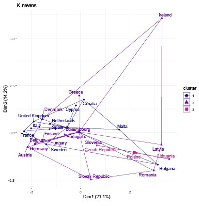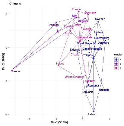Regarding the industrial indicators, the results validating the method used are also encouraging. Austria, Belgium, Denmark, Germany, and Luxembourg, industrially developed countries, share the same cluster regardless of the algorithm used. Additionally, countries on the periphery of the EU are generally members of the same group (Greece, Ireland, Portugal, Spain, Italy). On the other hand, some small economies that have recently joined the EU also generally share the same group. One group includes Bulgaria, Croatia, Cyprus, and Malta, while another, the Republic of Slovakia, Romania, Lithuania, Latvia, and Poland.