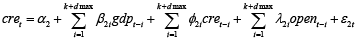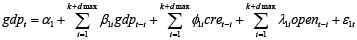 gdp= 24.95 + 0.01 cre + 0.04 open (0.001) (0.002) |