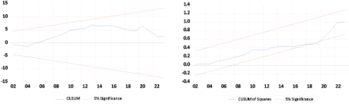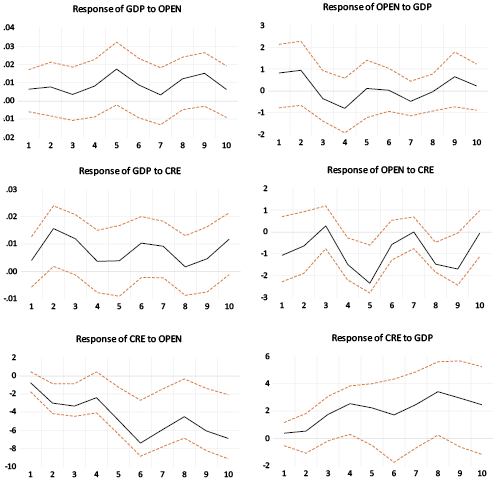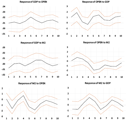 The Granger causality test based on VECM investigated the causal relationship between financial development and economic growth. The test results indicate that the credit supply to the private sector is the leading cause of short-term and long-term economic growth. Using money supply growth as the indicator for financial development revealed no causal relationship. The causality test results show a short-term causality from the openness indicator to bank credits given to the private sector. In addition, there is a two-way causality between the openness indicator and broadly defined monetary growth in the short term. Table 4 presents diagnostic tests at the bottom to assess the robustness of the model. Diagnostic tests include the Breusch-Godfrey serial correlation LM test, the Breusch-Pagan-Godfrey heteroskedasticity tests, and Jarque-Bera normality tests. The diagnostic test results show the absence of serial correlation, the absence of heteroskedasticity, and the presence of normality.
