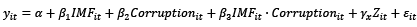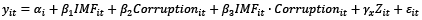 In Equations (1) and (2), the effect of corruption is not included. This is deliberate to first demonstrate the overall effects of IMF loans on the dependent variables. In a subsequent step, however, we incorporate corruption. This is done in two ways: firstly, by adding corruption as an additional regressor. Secondly, by adding the product of IMF and corruption, we demonstrate how the dependent variable changes concerning IMF loans and changes in corruption. Equations (3) and (4) depict these adjusted specifications using pooled OLS and fixed-effects, respectively.