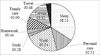 An average of 02:51 hours per day is allocated for personal care. According to experts, it is enough time to this area of time allocation (recommendation is [01:15 to 03:15] hours).