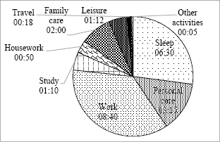 2. The time of day of self-employed person may be divided into nine time allocation areas: sleep, work, study, housework, family care, leisure (in narrow sense), personal care, travel, other activities. Other variables of time allocation areas do not change and do not affect the allocation of time of day of the employed population (ceteris paribus).