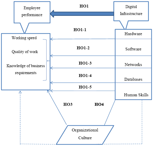 The rest of this paper is divided into several sections, with the first section serving as the introduction. The second section provides a comprehensive review of the literature on digital infrastructure, organizational culture, and employee performance. The third section describes the framework of the study and the methodology used in the analysis. The fourth section presents the results of the hypothesis analysis. Finally, the fifth section discusses the findings and provides recommendations for policymakers.