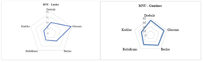 The number of beavers hunted in Skuodas district is 3.4% of Lithuania. During the examination, fourteen beaver sites were discovered, which were located in beds of Luoba and Guntinas rivers. There were 60% more beavers in the Guntinas than in Luoba. The average distance between active beaver sites is 279 meters. During the study, after counting the gnawed woody plants near the beaver habitats, the main plants used in beaver’s diet were identified: willow (30%), aspen (21%), and birch (18%).
