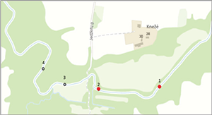 2 pav. Upių atkarpose aptiktų bebraviečių išsidėstymas: raudonai pažymėtos aktyvios bebravietės, pilkai – neaktyvios. Luobos upės atkarpa iliustruojama kairėje, Guntino – dešinėje pusėje (geoportal.lt M 1:1500)