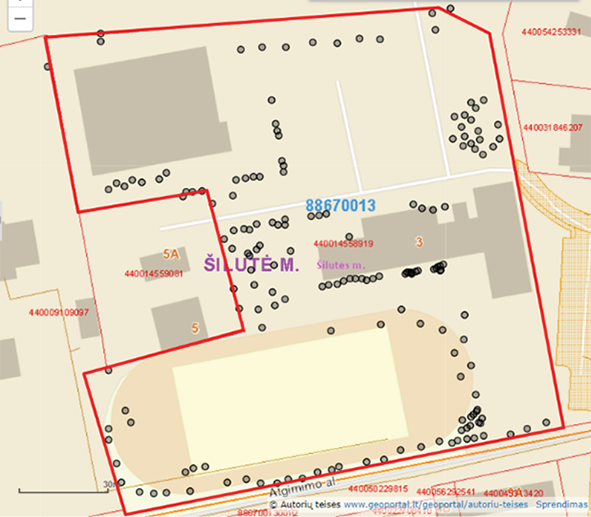 1 pav. Tiriamoji vieta Šilutės mieste – Šilutės Vydūno gimnazijos teritorijos ribos pažymėtos raudona linija (žemėlapio šaltinis: Geoportal.lt)
