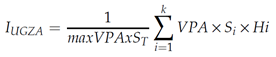IUGZA indeksą sudaro biologiniai ir biometriniai parametrai: VPA – kiekvienos rūšies potencialaus alergeniškumo vertė; ST – miesto parko plotas; k – rūšių skaičius parke; Si – kiekvienos rūšies užimamas plotas parke; Hi – didžiausias aukštis, kurį medis gali pasiekti subrendęs. VPA skaičiuojamas naudojant tris rūšiai būdingas savybes: alerginis potencialas (ap), žiedadulkių emisija (pe) ir pagrindinis apdulkinimo laikotarpis (ppp). Šios vertės parinktos iš kitų tokio paties pobūdžio tyrimų. VPA reikšmės, kurių rangai pateikti 1 lentelėje, svyruoja nuo 0 iki 36 – kuo didesnė reikšmė, tuo didesnis alergeniškumas (Carinanos et al., 2014; Carinanos et al., 2015; Jochner-Oette, 2018; Carinanos et al., 2019; Rispo, De Masi, Calandrelli, 2020).
