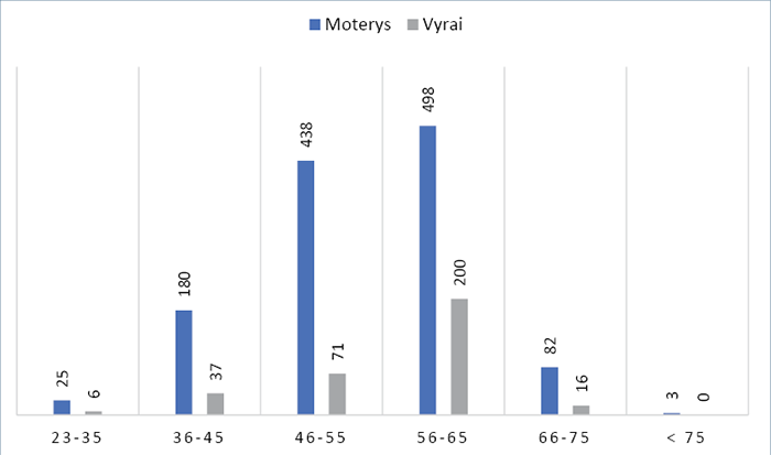 1 pav. Švietimo įstaigų vadovų pasiskirstymas pagal amžiaus grupes (sudaryta pagal Švietimo problemos analizė, 2021)