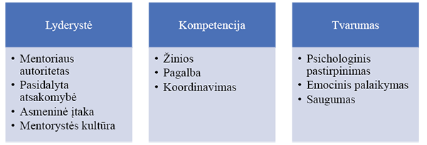 Švietimo kaitos procese ikimokyklinėse institucijose įtraukus mentorystės sistemą, IU įstaigų vadovai pajuto realią paramą, kuri padėjo jiems įgyti specifinių profesinių žinių, palengvino įsitraukimo į bendruomenę sunkumus, suteikė psichologinio pastiprinimo, tačiau svarbu, kaip mentorystė galėtų skatinti rinktis vadovaujančio darbo poziciją ir kaip galėtų prisidėti prie pradedančiojo vadovo profesinės patirties stiprinimo ir karjeros? Remiantis tyrimo rezultatais, potencialiems IU įstaigų vadovams labai svarbios ir profesinės karjeros pasirinkimui svarios yra šios mentorystės veiklos kategorijos: lyderystė, kompetencija ir tvarumas. Mentorystė, paremta tvirtomis kompetencijomis ir besivadovaujanti lyderystės bei tvarumo principais, gali turėti reikšmingos įtakos pretendento sprendimui rinktis vadovaujančio darbo poziciją. Svarbu palaikymas, vidinis pasitenkinimas, psichologinis-emocinis saugumas, žinojimas, kad bus asmuo, su kuo galės pasitarti, į ką kreiptis informacijos, sulauks emocinio palaikymo ir psichologinio pastiprinimo, jausis tikri, kad pagalba bus nuolatinė ir ilgalaikė (žr. 3 pav.).