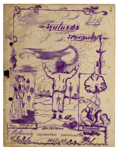 5 iliustr. Viršelis, sukurtas būsimo dailininko knygrišio Tado Lomsargio (?, 1905–1942). Saulutės spinduliai. Švėkšnos ateitininkų mėnesinis rankraštis. Švėkšna, 1925 m. XII.11. LMAVB RS F29-866.