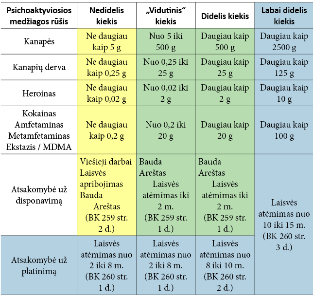 6 Sudaryta straipsnio autoriaus, remiantis BK ir Rekomendacijomis. Geltona spalva lentelėje pažymėti kiekiai, disponavimas kuriais be tikslo platinti neužtraukia laisvės atėmimo bausmės, žaliai – kai yra numatytos skirtingos sankcijos, tarp jų ir laisvės atėmimas, mėlynai – kai laisvės atėmimas yra vienintelė galima bausmė.