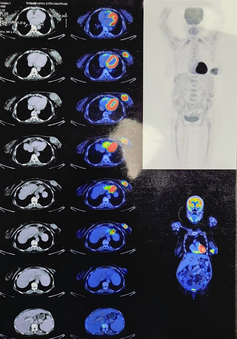 An 80-year-old female k/c/o HTN, COPD, hypothyroidism, and JAK 2 mutation positive polycythaemia vera presented with lump left breast of 8 months duration. No history suggestive of locoregional or distant metastases. On examination 6x4 cm lump retro areolar region, irregular surface, hard in consistency, fixed to breast tissue and overlying skin, not fixed to the chest wall. No palpable axillary lymphadenopathy, exa­mination of right breast was normal. Sono mammogram showed Lobulated hypoechoic lesion measuring 4.4x3.2x4.7 cm from 5 to 7 o’clock region in retro and periareolar region – BIRADS-V. Two clustered areas of pleomorphic calcifications in upper outer and central quadrants – BIRADS-4b (Figure 1). F18 FDG PET CT scan showed large heterogeneously enhancing FDG avid soft tissue mass with spiculated margins measuring 46x42x43 mm (max SUV – 13.2) in retro areolar region extending to lower quadrant. The lesion is seen abutting the overlying skin, the planes with underlying muscles maintained. No abnormal enhancing or FDG avid lesion in brain, lungs, liver, adrenal or skeleton (Figure 2). USG guided Core needle biopsy was done which revealed metaplastic carcinoma of adenosquamous type. ER, PR-positive, HER 2 Neu-Negative.