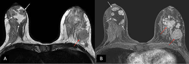 Figure 4. (A) Axial T2-weighted images and (B) T1-weighted fat-suppressed enhanced magnetic resonance imaging (MRI) – a capsulated, large-sized hamartoma can be seen located in the outer quadrants of the right breast, exhibiting a signal identical to normal mammary gland tissue, creating a “breast within a breast” appearance (white arrows). There are multiple masses in the contralateral breast with suspicious morphology, associated with a known invasive ductal carcinoma (red arrows). Image credits: El Yousfi Z, El Mansoury FZ, El Bakkari A, Omor Y, Latib R. Breast hamartoma with synchronous contralateral breast cancer: a case report. Cureus 2024; 16(8): e66534. DOI: 10.7759/cureus.66534. Reused under the terms of the Creative Commons Attribution License CC-BY 4.0. (https://creativecommons.org/licenses/by/4.0/deed.en).