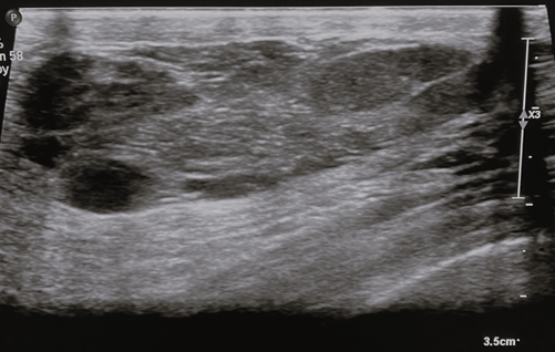Figure 3. Breast ultrasound – breast ultrasound shows a tissue formation with the long axis parallel to the cutaneous plane, well-circumscribed, heterogeneous, with hypoechoic with hyperechoic trabeculae and posterior acoustic enhancement. Image credits: El Yousfi Z, El Mansoury FZ, El Bakkari A, Omor Y, Latib R. Breast hamartoma with synchronous contralateral breast cancer: a case report. Cureus 2024; 16(8): e66534. DOI: 10.7759/cureus.66534. Reused under the terms of the Creative Commons Attribution License CC-BY 4.0. (https://creativecommons.org/licenses/by/4.0/deed.en).