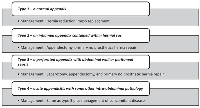 Figure 1. Losanoff and Basson classification of Amyand’s hernia