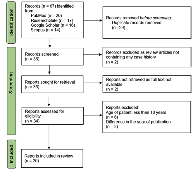 Study Selection. As depicted in Figure 2, the electronic database search resulted in a total of 67 articles. After excluding 29 duplicated articles, titles and abstracts of 38 articles were screened, after which full texts of 36 potentially relevant articles were retrieved for eligibility criteria. Finally, 26 articles were included in the review after detection of an age below 18 years in 6 patients and a difference in the year of publication in 2 case reports.