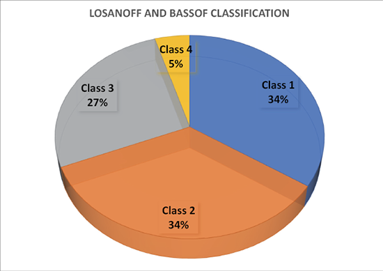 Losanoff and Bassof classification. 8 (30.7%) hernias belonged to Class 1, 9 (34.6%) to Class 2, 6 (23.1%) to Class 3, and 3 (11.5%) to Class 4, as shown in Figure 4.